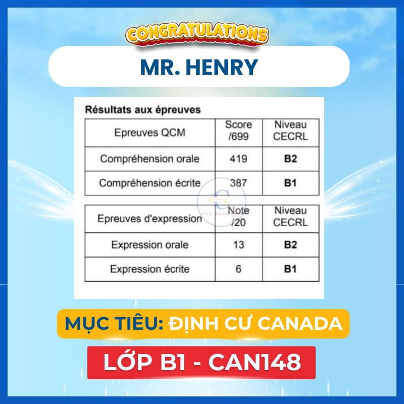 Học viên đang sống tại Canada, Nói chỉ ở mức A1, gặp khó khăn về phát âm do quen hệ thống âm tiếng Anh. Với mục tiêu thi TCF Canada B2, bạn đã chọn đồng hành cùng Clé Academy. ạn đã tập trung luyện phát âm và phản xạ nói trong 2 tháng, giúp nâng kỹ năng Nói từ A1 lên B2. Kết hợp với việc luyện đề từ sớm trong lớp B1, quen cấu trúc bài thi và tăng sự tự tin khi vào phòng thi.