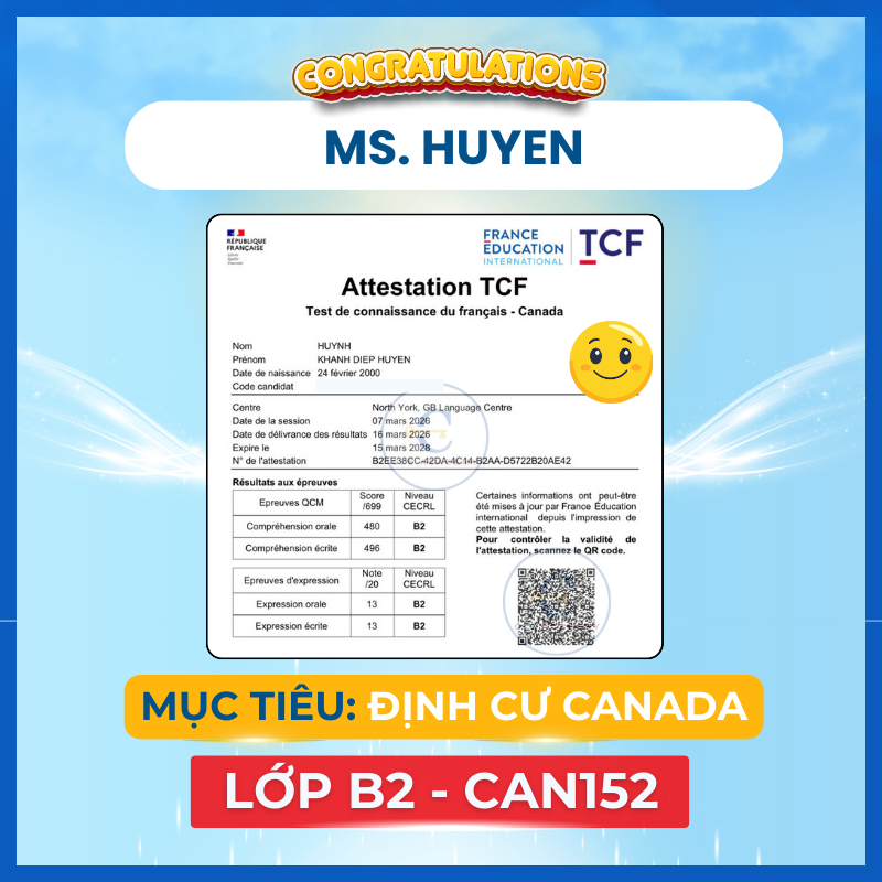 Học viên sinh sống tại Canada, đặt mục tiêu thi TEF Canada để phục vụ hồ sơ định cư. Dù chỉ học ở trình độ B1, bạn đã nỗ lực vượt bậc và đạt kết quả B2 trong kỳ thi chính thức.